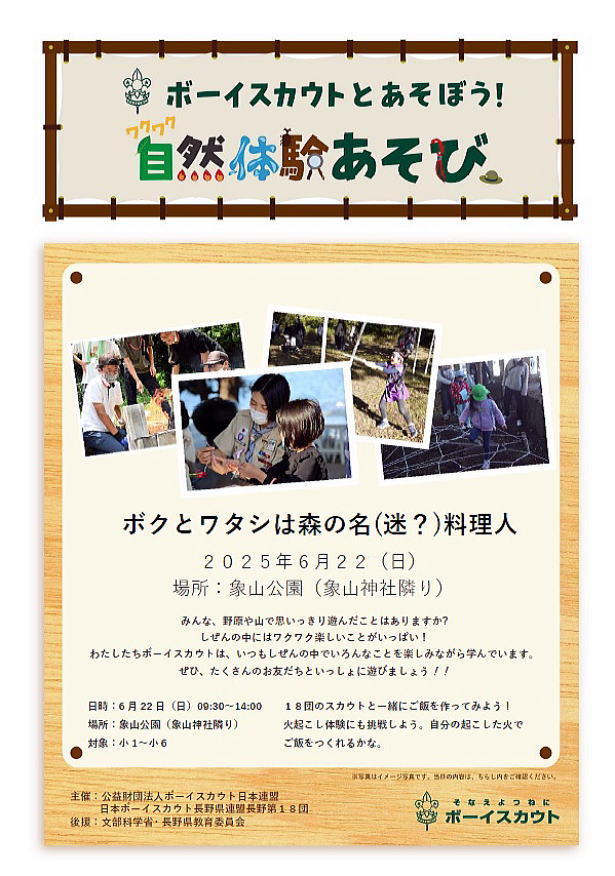 | このホームページ上のスカウト運動に関する事項は、ボーイスカウト日本連盟ホームページ掲載「ボーイスカウト関係のホームページ開設」に沿って、ボーイスカウト長野第18団ボーイ隊隊長(春日邦夫)<nagano.bs18[★]gmail.com>の責任のもとに掲載しています。 ※迷惑メール防止のため、メールアドレスの[★]を@に変えて下さい。 当ホームページと相互リンクを希望されるボーイスカウト関係のホームページ制作者の方は、「お問い合わせ」のリンクよりご連絡をお願いします。 当ホームページに掲載している活動状況の写真については、無断複製及び転載をご遠慮願います。 閲覧推奨環境 Google Chromeの最新バージョン 1024×768以上のモニター解像度に最適化されています。スマートフォンでの閲覧は、画面の表示レイアウトが一部正しく表示されない場合があります。 |