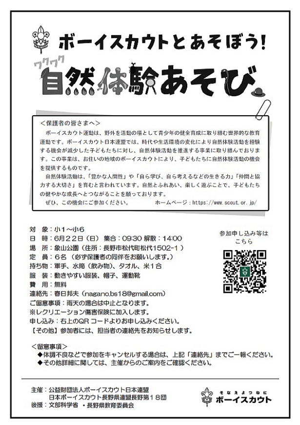 | 私たちボーイスカウト長野第18団は、真田十万石のまち「長野市松代町」を中心に活動しています。 このホームページは、当団に所属するスカウト及び保護者、ご支援いただいている皆様への活動報告の場として開設しています。またボーイスカウト運動に興味をお持ちの方への情報発信の場としても活用していきたいと思います。当団に興味のある方のお問い合わせをお待ちしております。 |